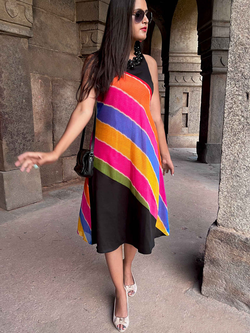 SKYLER SANTORINI STRIPES SILK KOTA DORIA REVERSIBLE DRESS