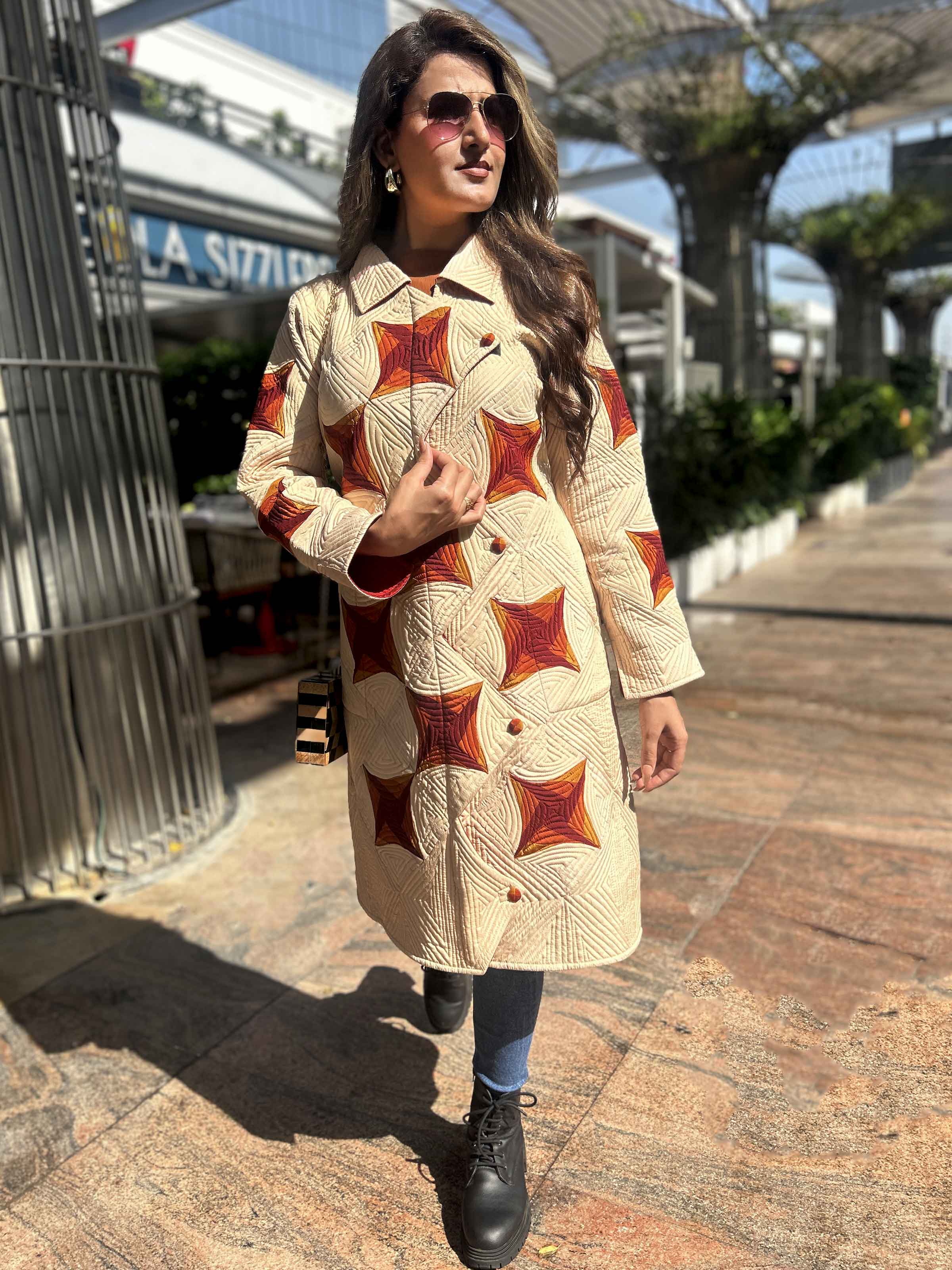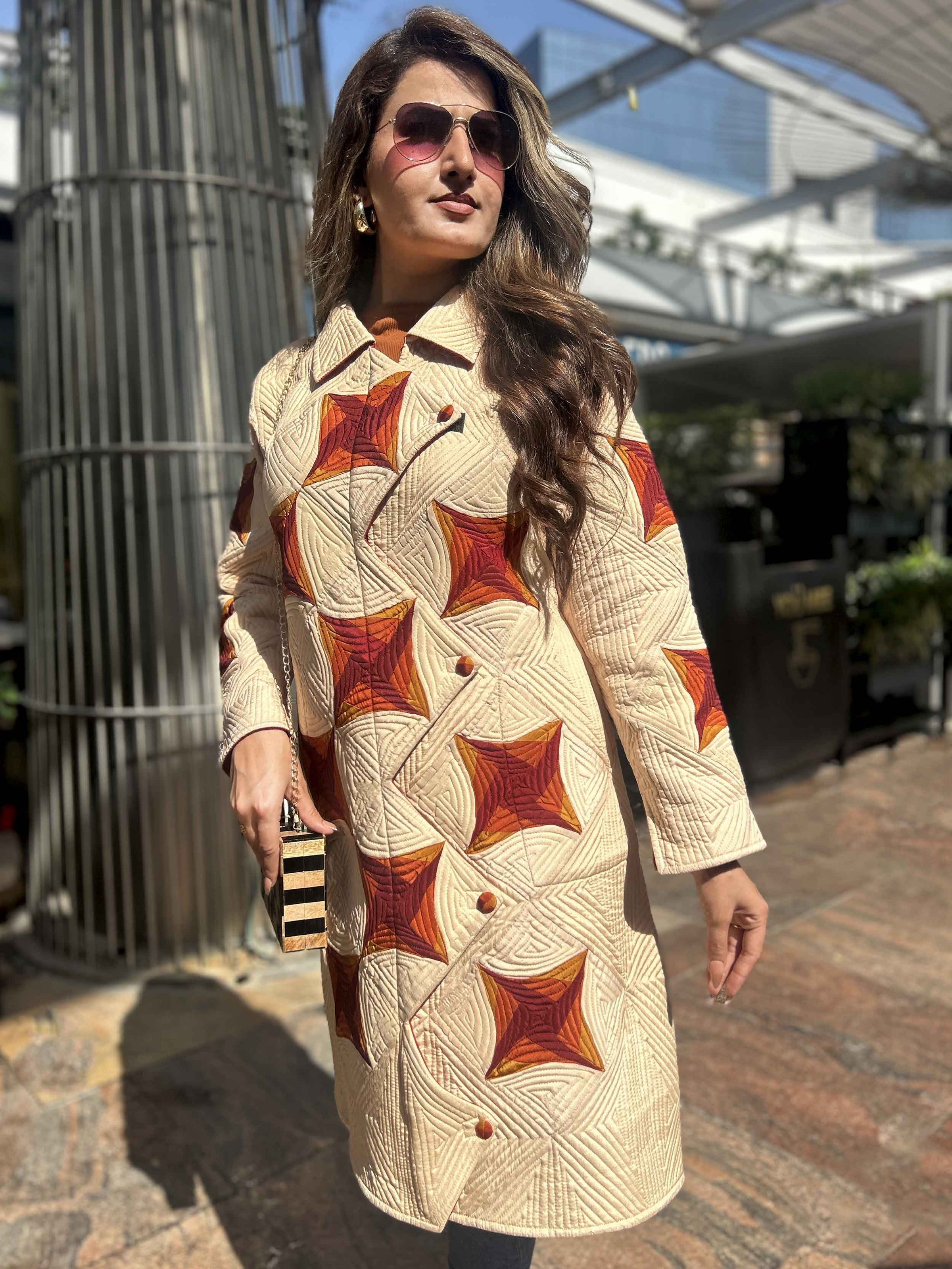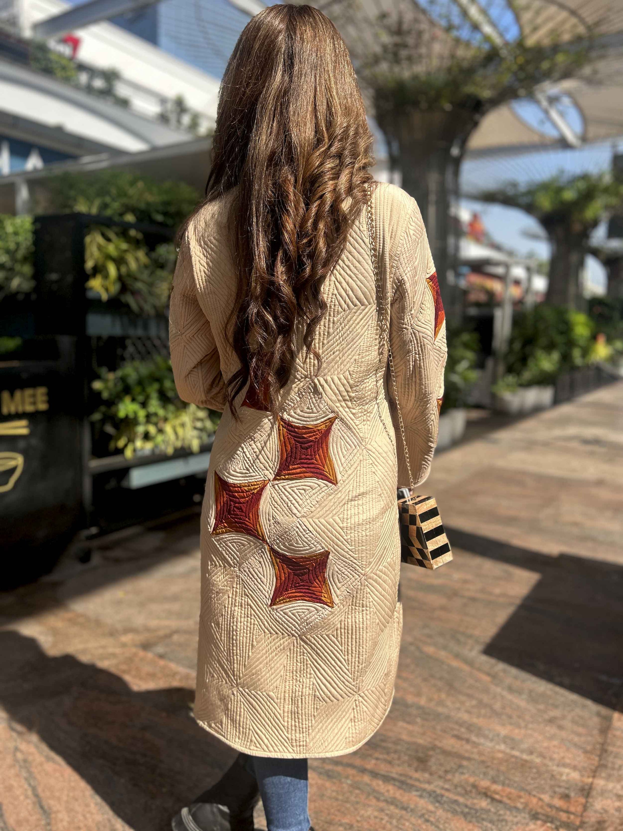 Part of the 'Vermont Autumn Collection', this quilted jacket made with patches of Pure Silk depicting a pinwheel. The patchwork is very intricate and is made in fall colors – beige, bronze and brown.