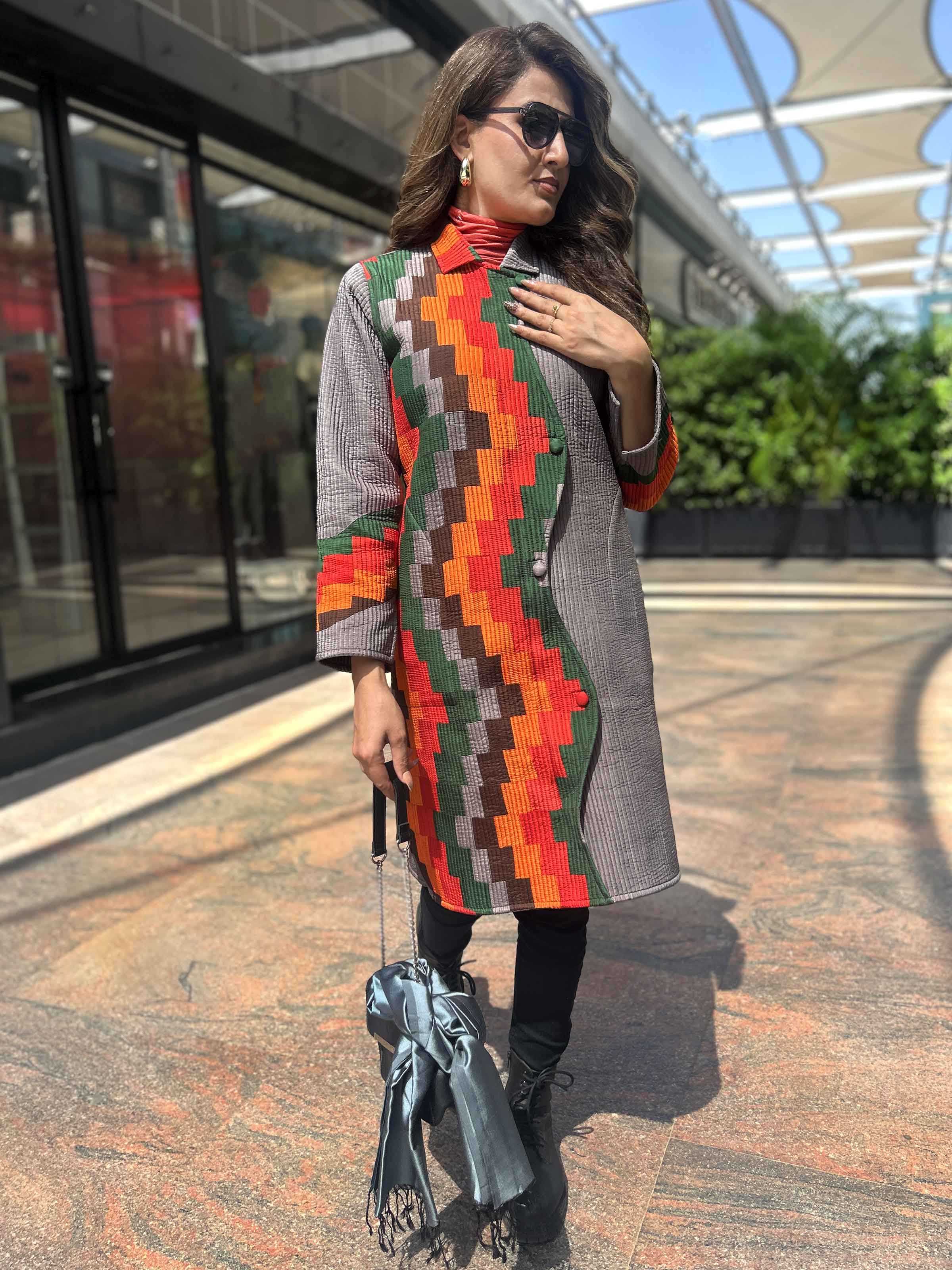 Part of the 'Vermont Autumn Collection', this quilted jacket made with patches of Pure Silk is inspired by Aztec designs. The patchwork is very intricate and is made in fall colors seen everywhere in nature.