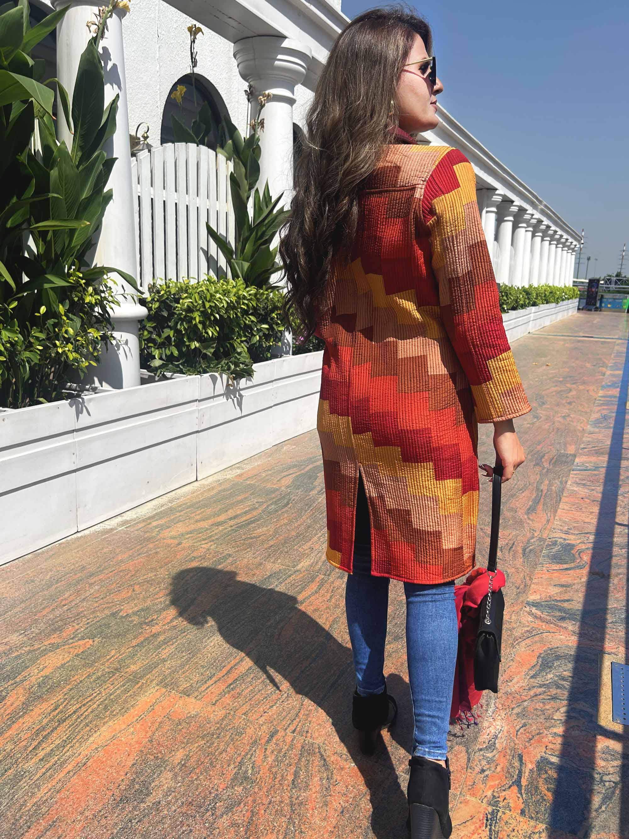 Part of the 'Vermont Autumn Collection', this quilted jacket made with patches of Pure Silk is inspired by the colors of ripe acorns which are harvested from oak trees in late fall when the leaves have almost all fallen and turned brown. These ripe acorns are in shades beige, brown and burgundy. The patches are attached together in a diagonal pattern and quilted in a straight lines to give it a glamorous look.
