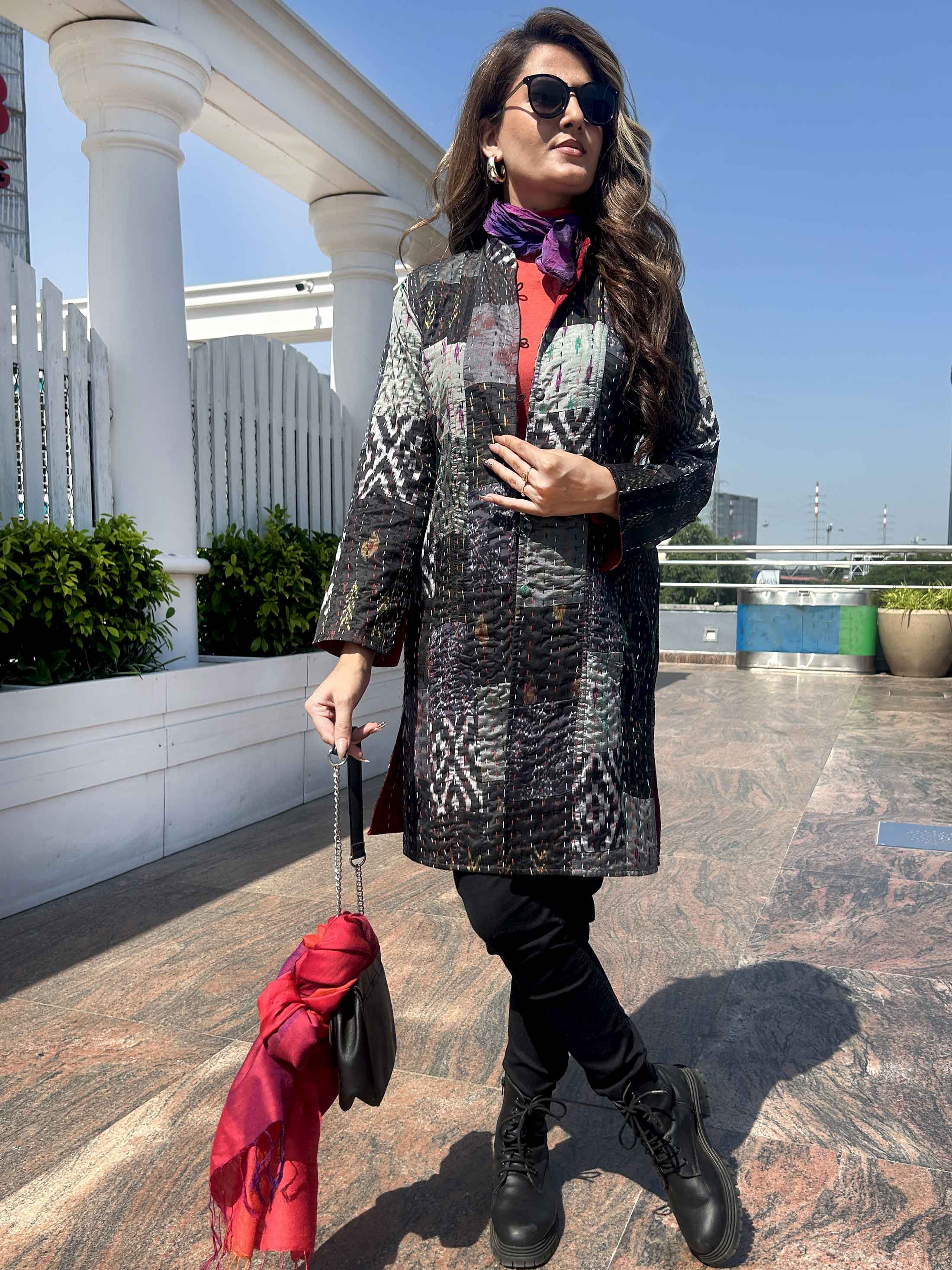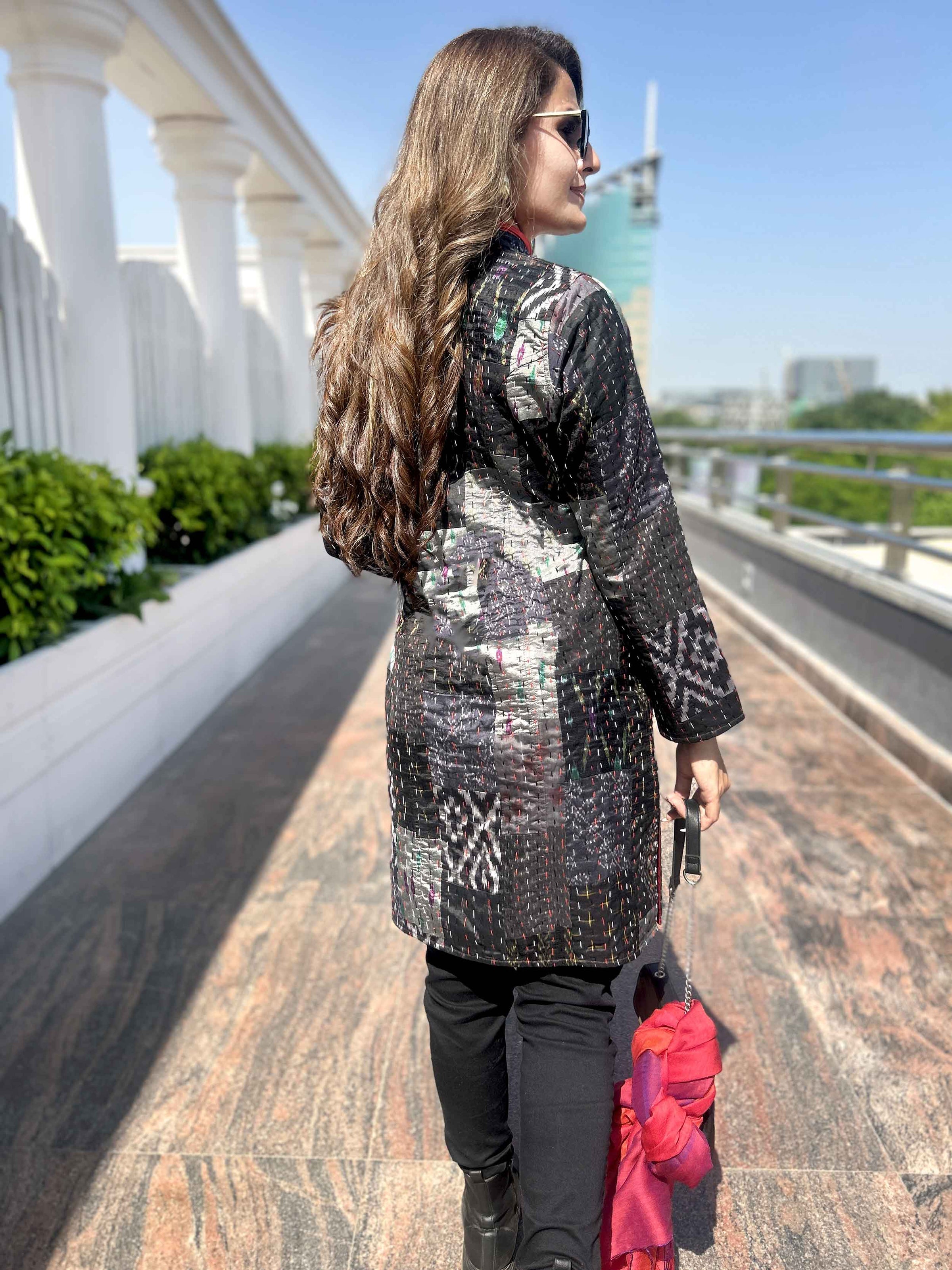 Part of the Vermont Autumn Collection, this trench coat made with patches of Patola Silk Sarees is inspired by the shades of gray seen in late Autumn. The The rectangular patches are attached together and stitched using 'Kantha Stitching Technique' to give it a glamorous look.